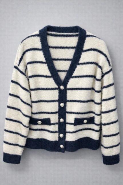 Cardigan femme rayé à boutons perlés – doux et chaud